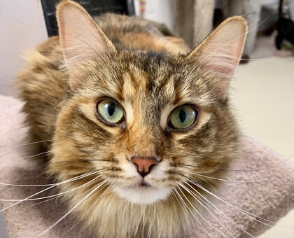 She loves to run and play but also loves to curl up with you as you watch your favourite TV shows. Her nickname is “Potato Kitty” and she loves it when you pet her down her nose. She is a very independent lady and would do best as the only queen of her home.