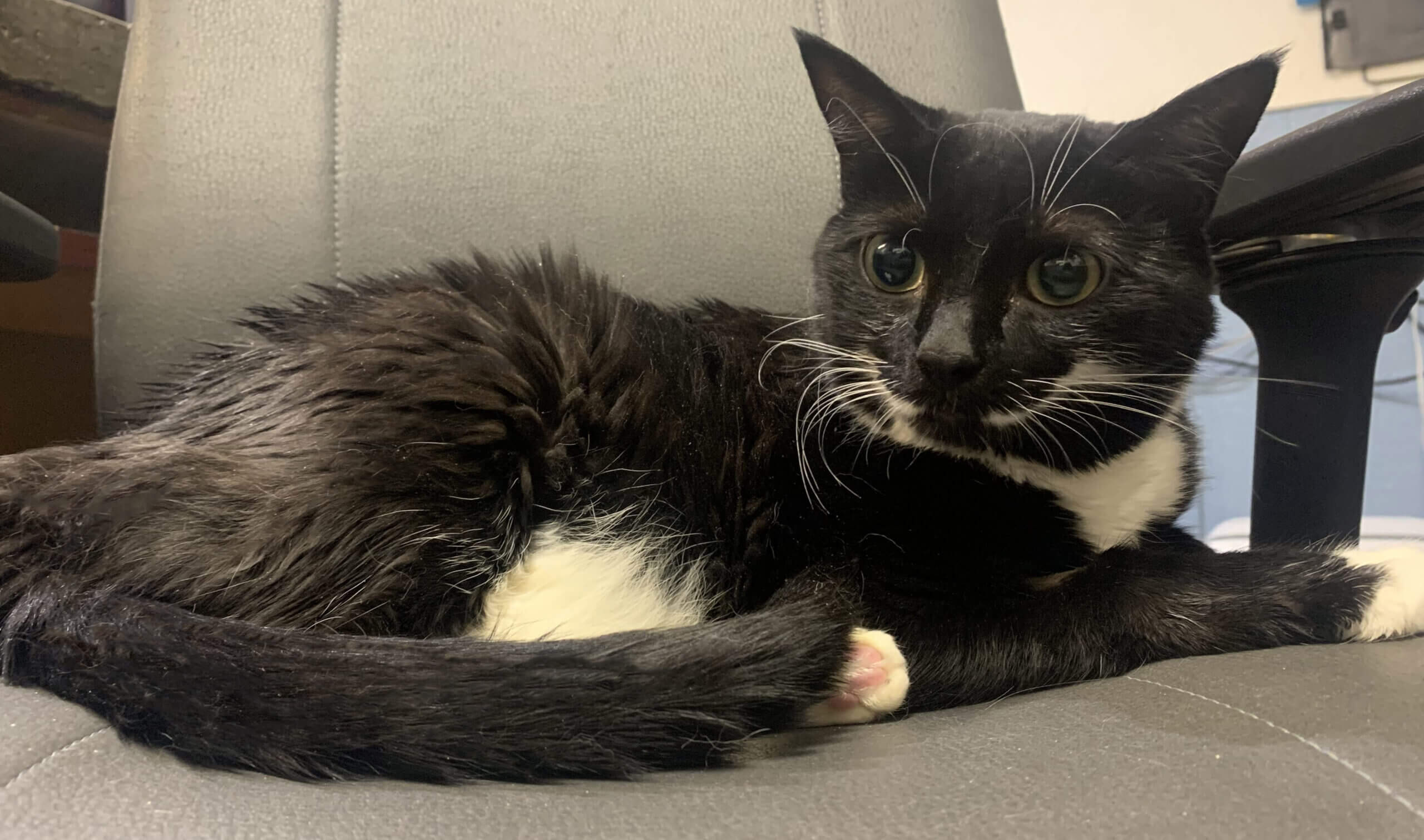 Hi, my name is Mitts. I am a lovely tuxedo cat who is a bit of a sassy girl. However, my sass won’t stop you from falling in love with me! I am a surrendered cat living at the Shelter while waiting for my furever home. Take notes: In my furever home, a Mitts chair is a must since I am quite a chair hog. You’ll usually find me sitting on Edna’s chair in front of the computer. Edna pretends to be a bit upset with me when I sit right behind her, but this seat has been dubbed *my* chair by the Volunteers! I enjoy being stroked close to my head (in moderation!). I do tolerate being brushed for a few moments before I get overstimulated by the attention. I have recently received some dental work to make my teeth clean and healthy. Unfortunately, I needed some teeth pulled because of the poor condition they were in. The bonus is that since the Vet did my dental work, my mouth feels so much better. If you are interested in meeting me or any of my kitty acquaintances, please call 403-946-0400 to make an appointment. We love people coming in to meet us! If you are interested in supporting me and my peers, please consider making a donation to Tails to Tell. All funds go to supporting Vet care, supplies and food that the residents at the Shelter need to ensure we live the happiest of lives!