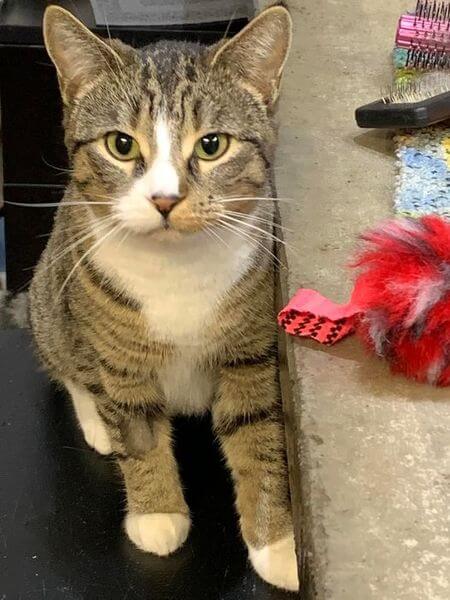 Mousie is a 3 year old tabby who relishes a good chin scratch, and will roll over and show you her tummy. Mousie is very smart and a bit of a magician who has figured out how to open doors that have latch handles! She has received all of her vaccinations, she’s spayed, microchipped, tattooed and she comes with one month pet insurance! Everyone who sees this sweet girl falls for her charms! Guaranteed you will get a full on cuddle if you come in to see Mousie at Tails to Tell.