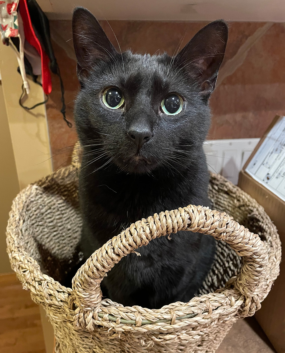 Potter was a motherless little black kitten who was brought into the shelter with his orange brother, Pumpkin. Two little Halloween kittens. As Potter learned how to be an indoor kitten and do the proper kitten things, he also made his presence known at the Shelter. Potter was a little bit naughty and made me laugh as he climbed up and down and pranced around. He was always ready for endless play and running up and down the hallway after springs and balls. Potter was a retriever who brought toys back so the volunteers would throw them again. Potter joined our family three years ago – our two older, more sedate cats taught him the ropes while he taught them how to play again. This little black panther crawled right into our hearts and continues to brings us daily joy with his antics.