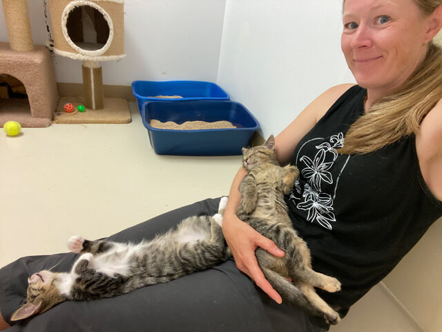 Volunteers do many jobs at the Shelter vary from sifting litter boxes and sanitizing kennels, to administering medications, bottle feeding kittens, helping with fundraisers, writing grant applications, picking up donations, dropping off bottles at the depot, crawling under trucks and trailers to rescue stray and injured kitties, and spending time loving and playing with the cats and kittens. There are rarely two days that are the same at the Shelter as volunteers work together as an amazing team to care for our cats and kittens.